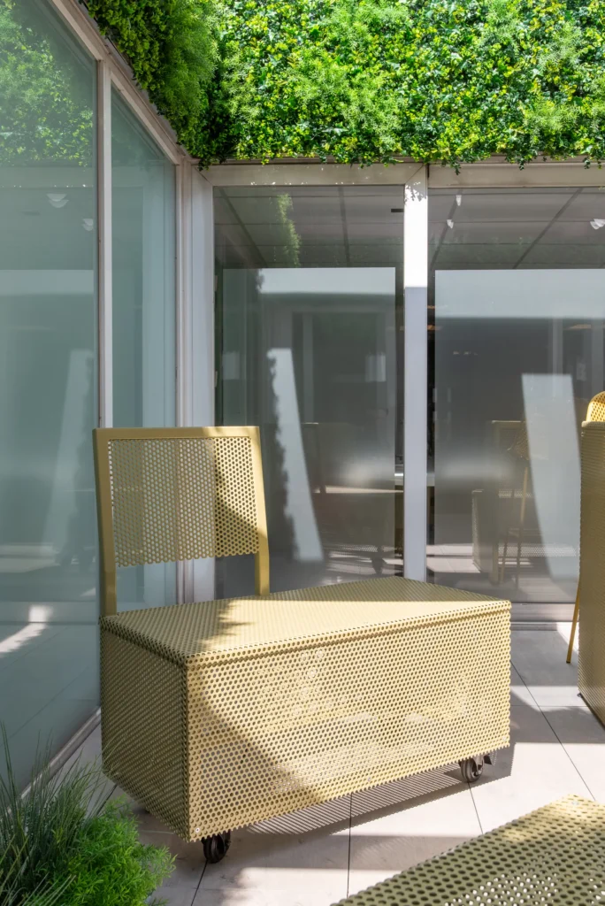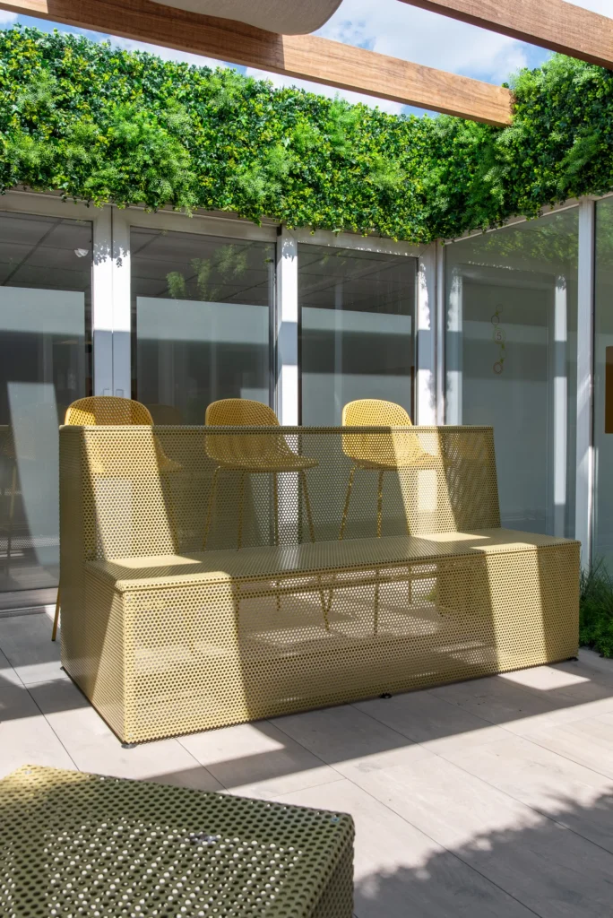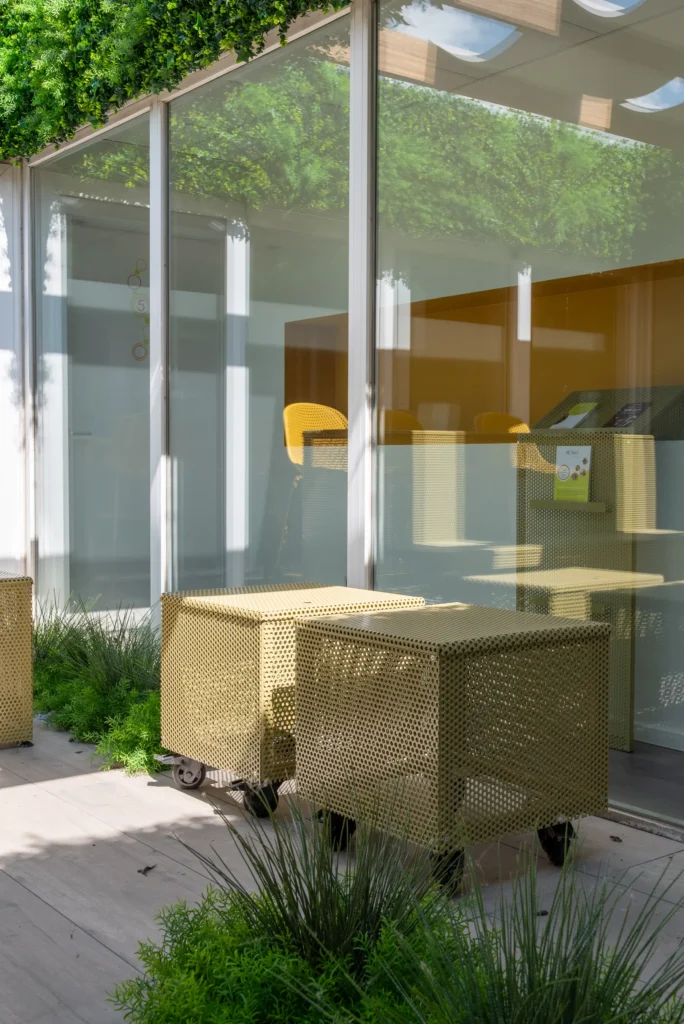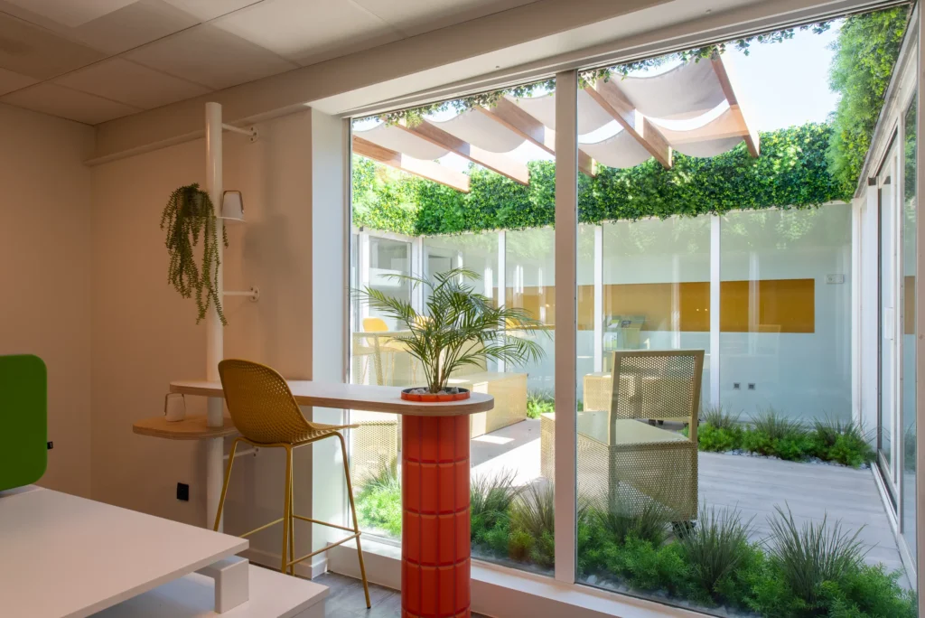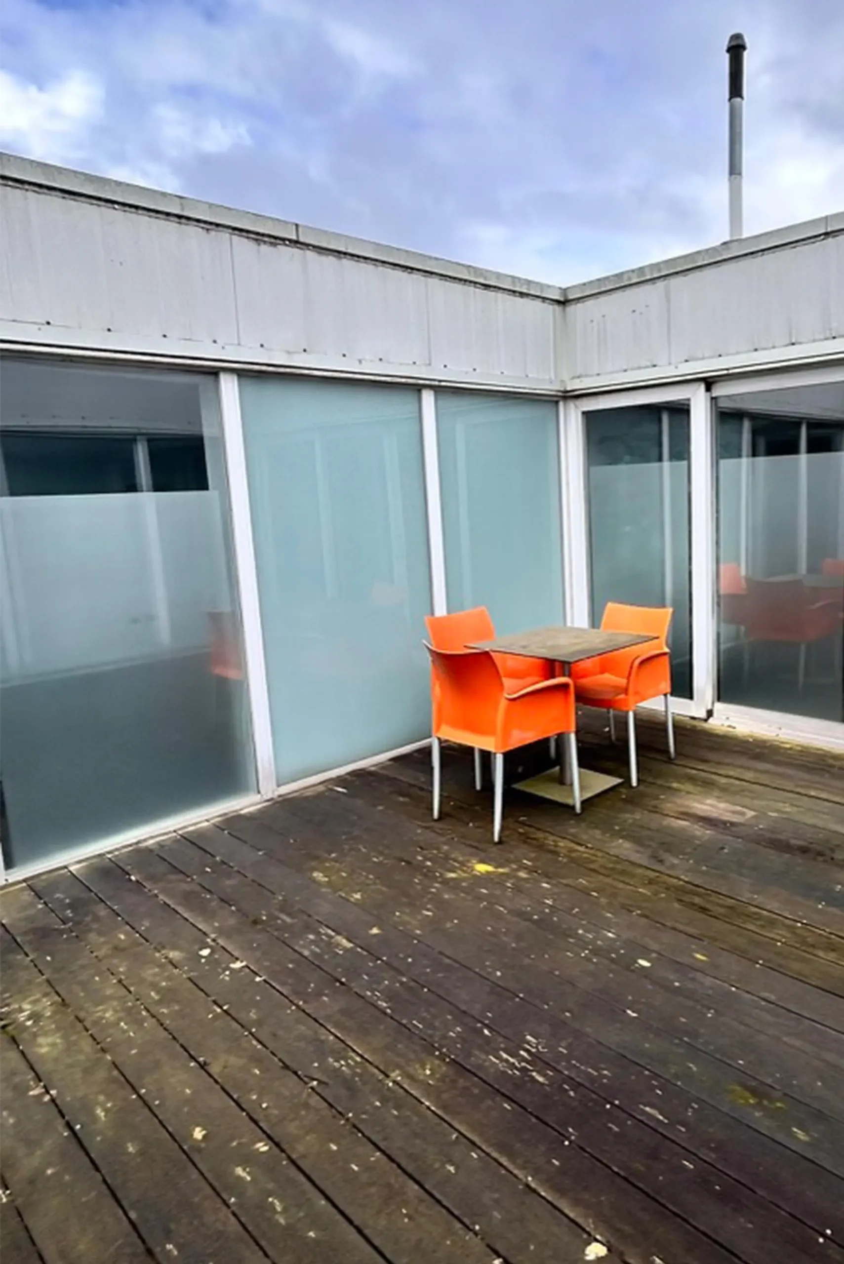 De flexibele workshopruimte is ontworpen om zich moeiteloos aan te passen aan diverse activiteiten. Dankzij het slimme meubilair kunnen opstellingen eenvoudig worden gewijzigd. Aansluitend hierop hebben we de patio getransformeerd tot een ontspannen buitenruimte met een vakantiegevoel, ideaal voor een informele bijeenkomst of een moment van rust.