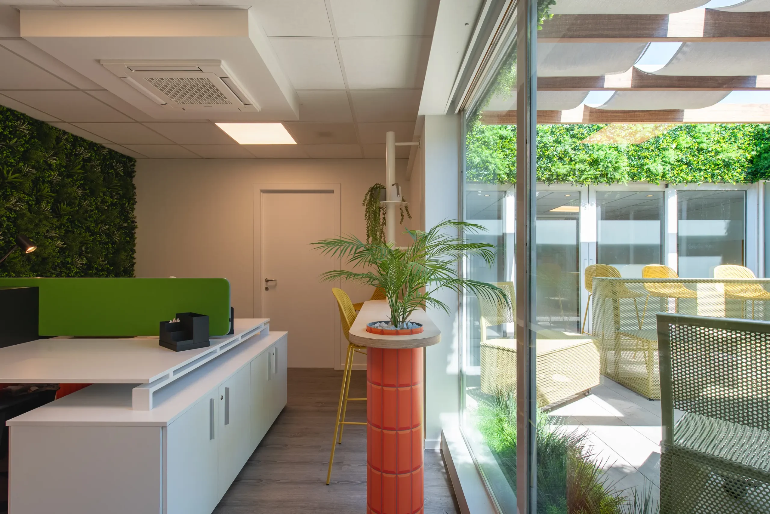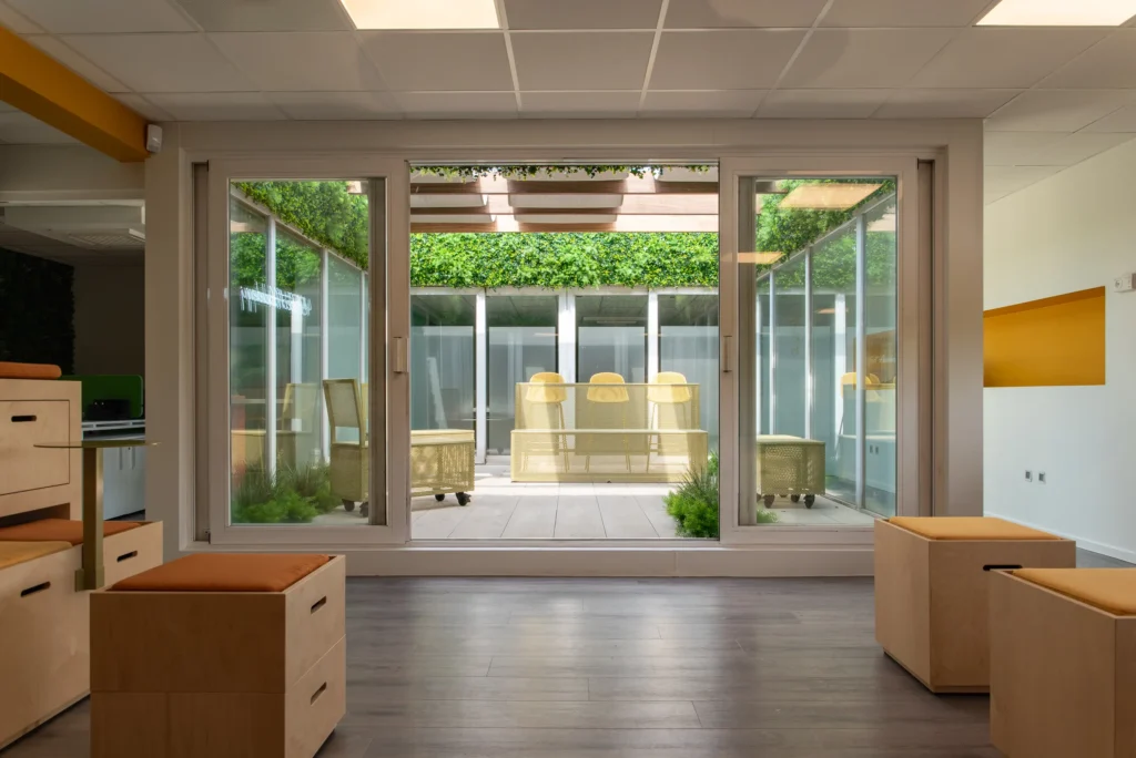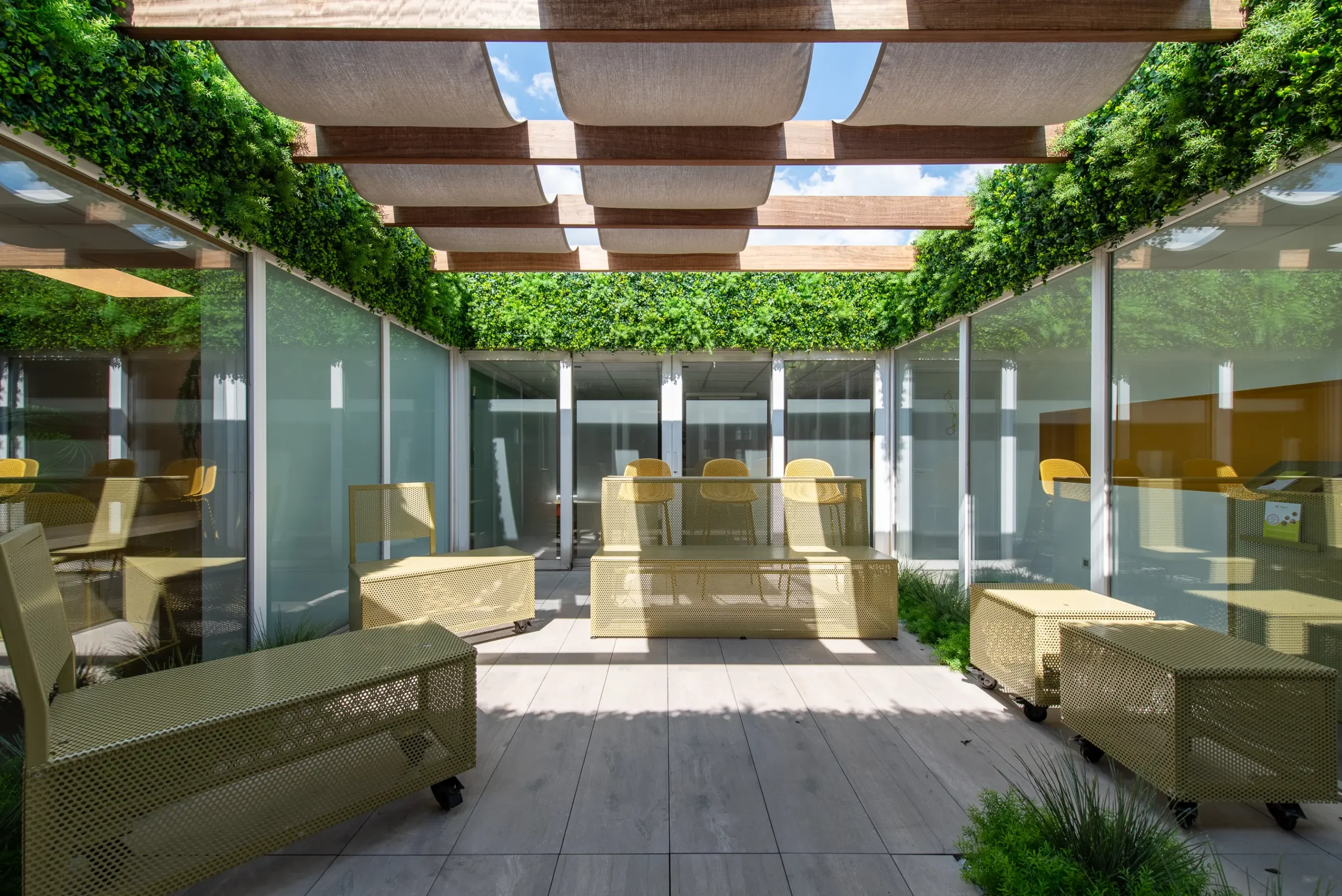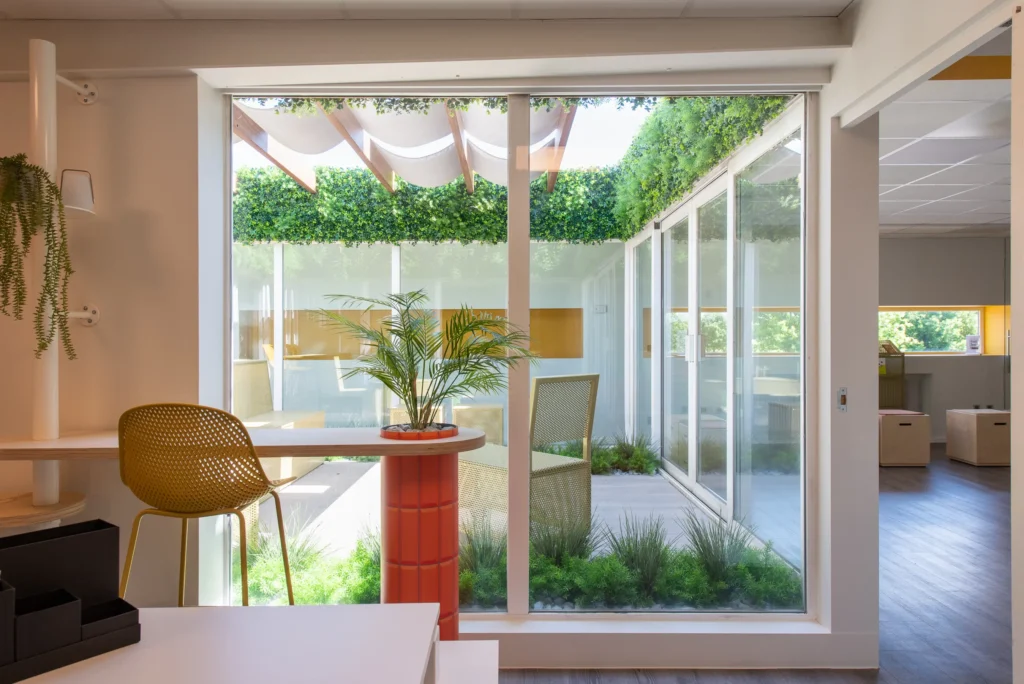 De flexibele workshopruimte is ontworpen om zich moeiteloos aan te passen aan diverse activiteiten. Dankzij het slimme meubilair kunnen opstellingen eenvoudig worden gewijzigd. Aansluitend hierop hebben we de patio getransformeerd tot een ontspannen buitenruimte met een vakantiegevoel, ideaal voor een informele bijeenkomst of een moment van rust.