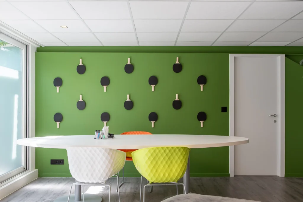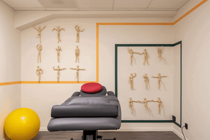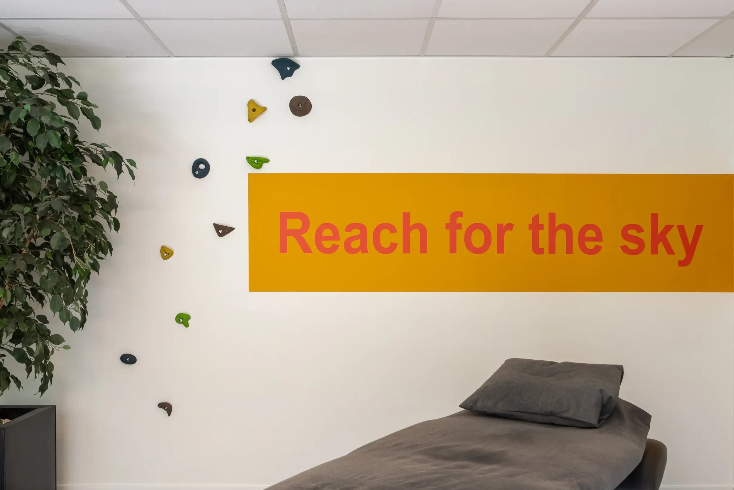 Een energieke focus op beweging in de behandelruimtes. De kiné- en behandelruimtes ademen een dynamische sfeer, met subtiele knipogen naar de sportieve context van Gymtonic. Denk aan speelse elementen zoals de pingpongpaletten en de houten mannetjes aan de muur die individueel beweeglijk zijn. De motiverende “Reach for the sky” quote, vergezeld van klimgrepen, benadrukt op inspirerende wijze de centrale boodschap: bewegen staat centraal in het herstel en de vooruitgang.
